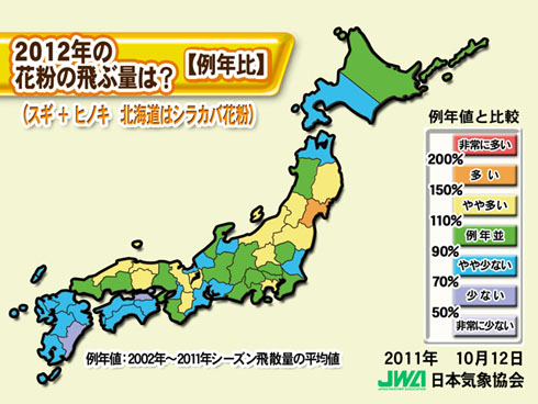 2011年の夏の気象は、記録的な猛暑となった2010年の夏に比べると花芽が多く形成される気象条件にはなりませんでした。このため、2012年春の花粉の飛散数は2011年の春に比べると少なく、30〜70%の所が多い見込みです。 |